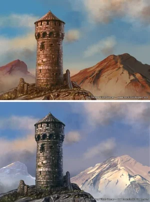 Tower of joy, by Henning Ludvigsen, FFG©. Note: The bottom image is the original version, but was redone to make the top image, which features the red mountains of Dorne.